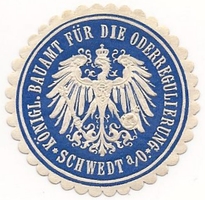 ![]() Königl. BA f. Oderregul. Farbe: kornblumblau Größe: Ø 40 mm Anm.: 1889 - 1918 |