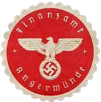 ![]() Finanzamt Angermünde Farbe: ziegelrot Größe: Ø 35 mm Anm.: GdR, gesucht |